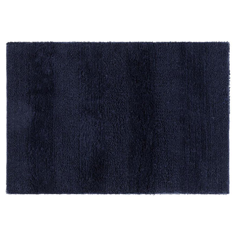 Vendela Marinblå från KM Carpets är en vändbar badrumsmatta i 100 % bomull. Mattan har ett mönster i high and low-teknik med breda ränder som ger en diskret men tydlig struktur i en djup mörkblå ton.