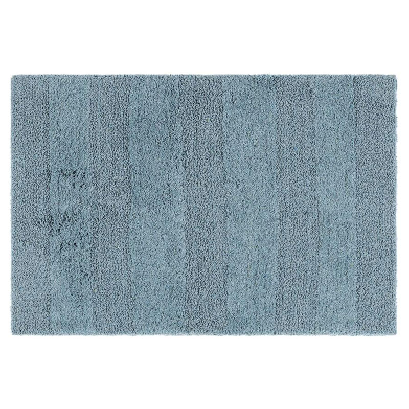 Vendela Petrol från KM Carpets är en vändbar badrumsmatta i 100 % bomull. Mattan har ett mönster i high and low-teknik med breda ränder som ger en diskret men tydlig struktur i en dov grön-blå nyans.