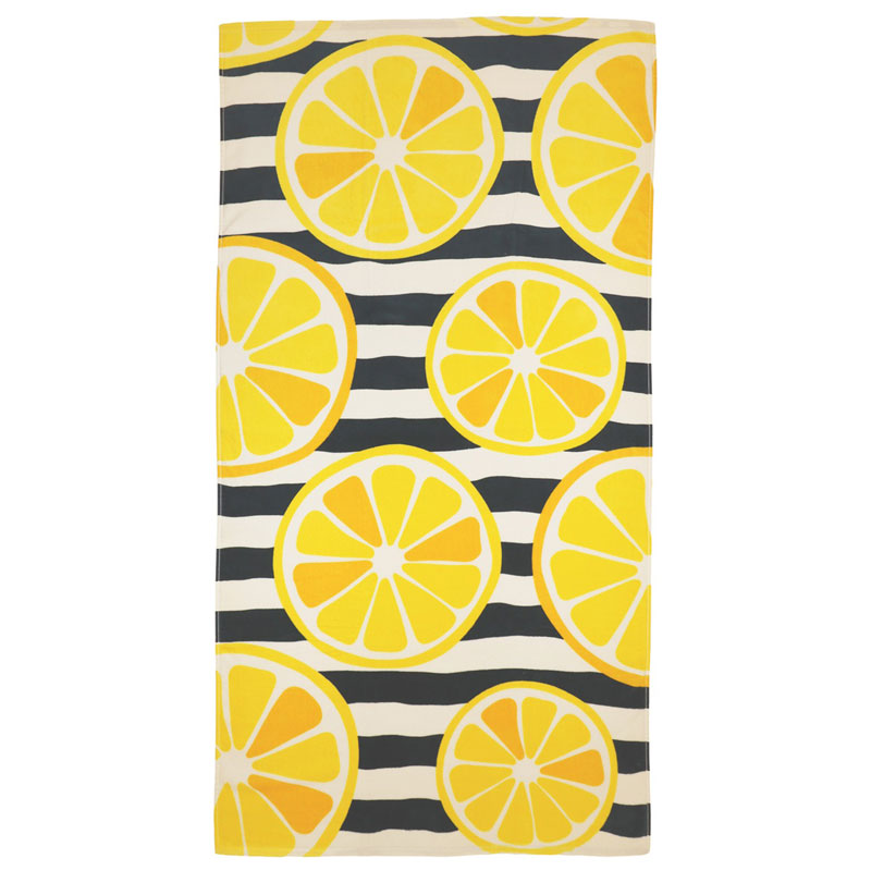 Läckert badlakan med citroner på blåa ränder som bidrar till sommarkänslan!