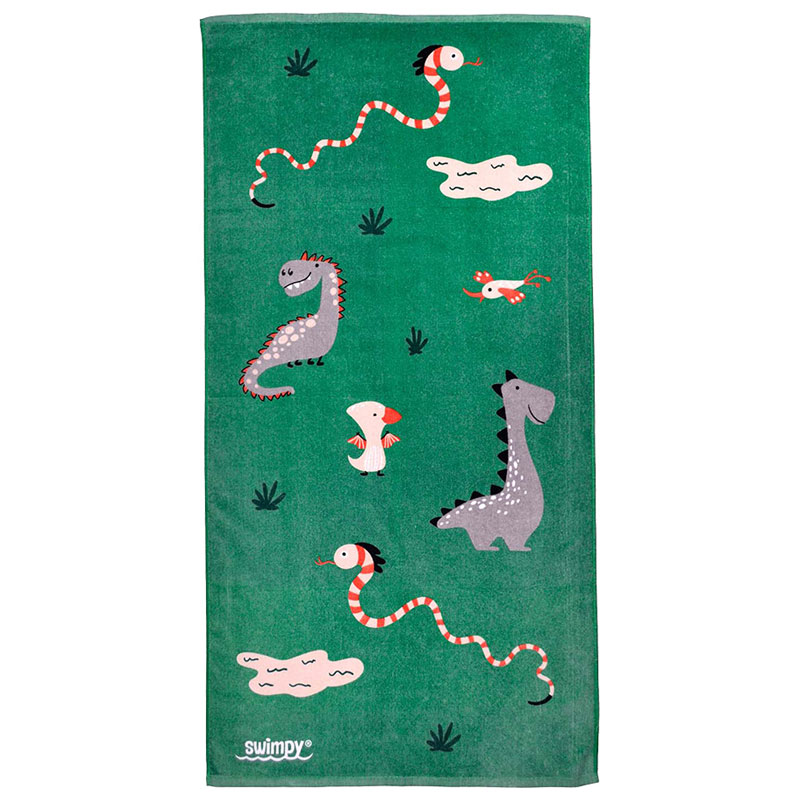Läckert badlakan från från Swimpy med motiv av gulliga dinosaurier på en grön bakgrund.