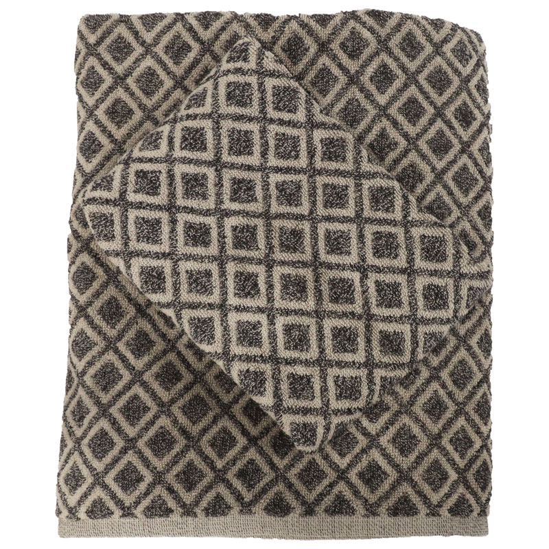 Rubin från Nina Royal, mjuk frottéhandduk med jacquardvävt rutmönster i svart på en linnefärgad grund.