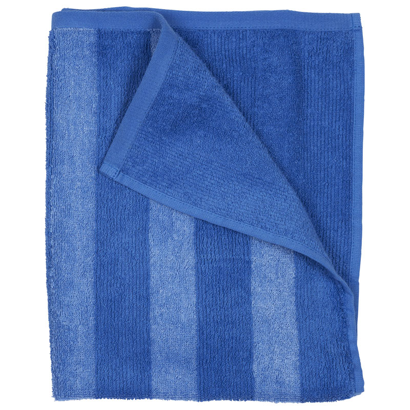 Mjuk frottéhandduk i blå nyans tillverkad av en bomull/polyester blandning, kombinationen skapar en vacker randigt effekt på framsidan vid infärgningen.