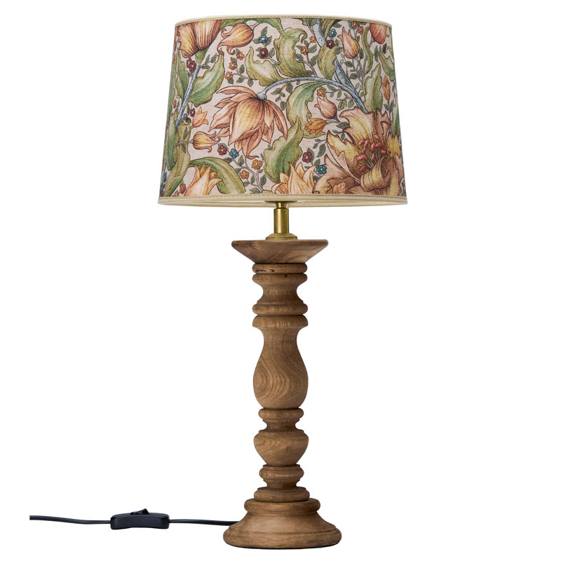Vacker bordslampa från PR Home, med en lampfot av trä och en tjusig lampskärm. Foten är svarvad och lampskärmen har ett tilltalande växtmönster i vackra färgskalor.