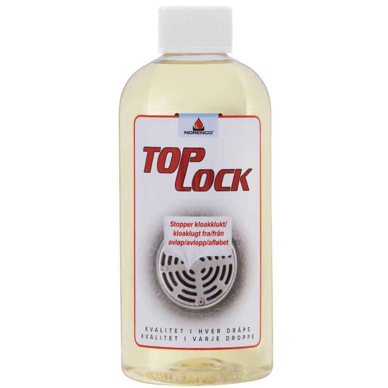 Top Lock stoppar kloaklukt från avlopp och vattenlås som torkat ut. Den lägger sig som ett lock över vattnet och förhindrar uttorkning/dålig lukt. Innehåller inga farliga kemikalier och är biologiskt nedbrytbar.