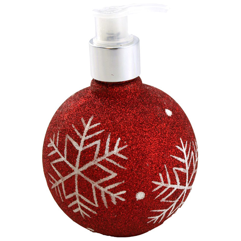 Julig och charmig handtvål med pump från Dynäs, i motiv av en tjusig julkula med fina detaljer av snöflingor. Med en trevlig doft av kanel.