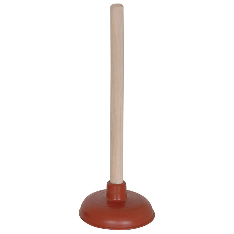 Smidig vaskrensare för avloppsrör. Vaskrensaren har träskaft och orange sugkopp i TPR.