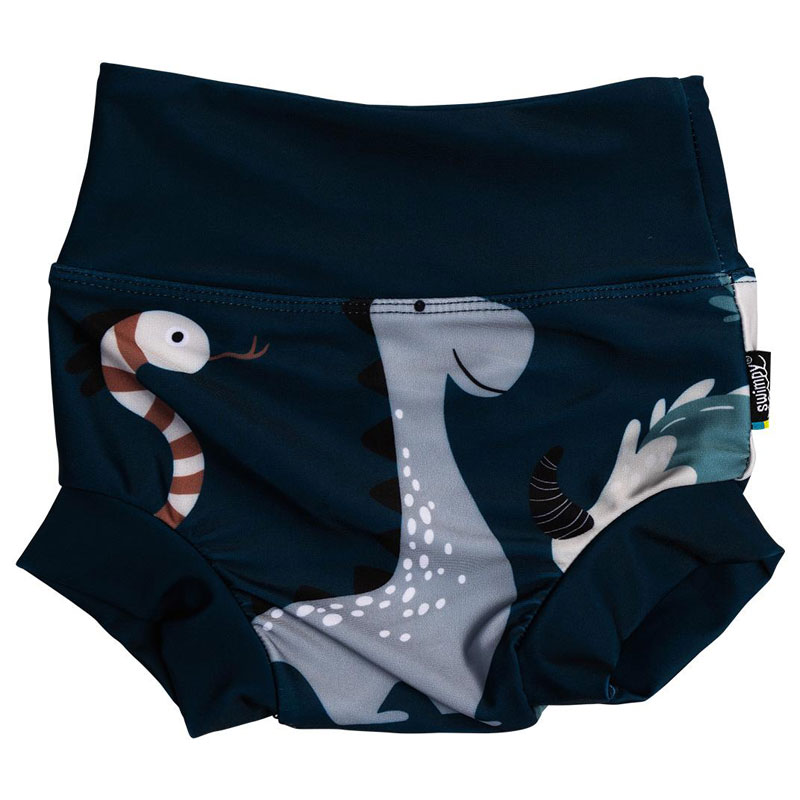 Fin UV-badblöja från Swimpy med motiv av dinosaurier på en svart botten.