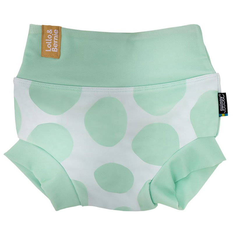 Fin UV-badblöja från Swimpy från Lollo och Bernie-kollektionen. Badblöjan är ljusgrön med gröna prickar.
