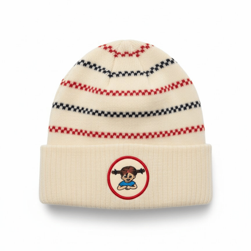 Härlig barnmössa med motiv av Pippi mot en vit botten.