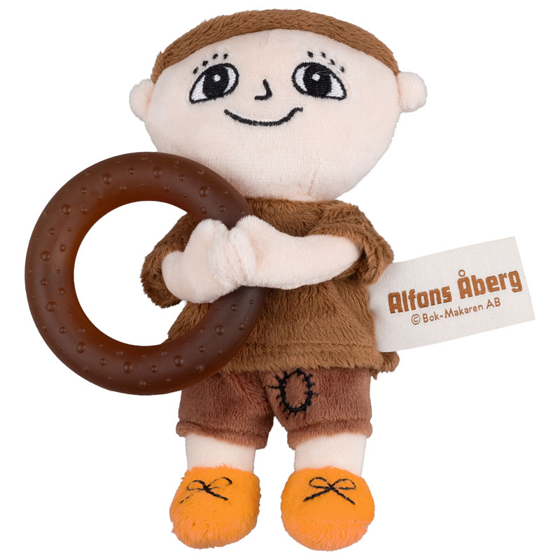 Alfons Åberg bitleksak med naturgummiring från Rätt Start. En fin figur i plysch som håller i en bitring i naturgummi.