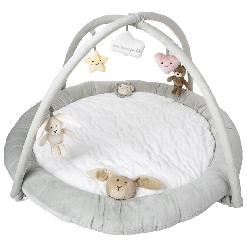 Mysigt babygym som lockar till lek. Den tjocka, vadderade lekmatta ger en mjuk och trygg plats för barnet att ligga och utforska samtidigt som den skyddar mot kalla golv.