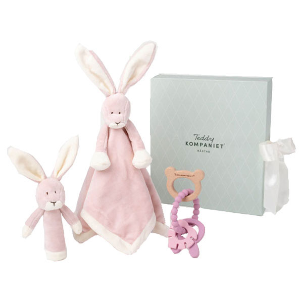 Vackert presentset från Teddykompaniet innehållande en klassisk dimrosa Diinglis-snuttefilt i form av en kanin, en matchande skallra och en bitring i trä och slitstark silikon (BPA-fri). Allt levereras i en elegant presentförpackning med sidenband.