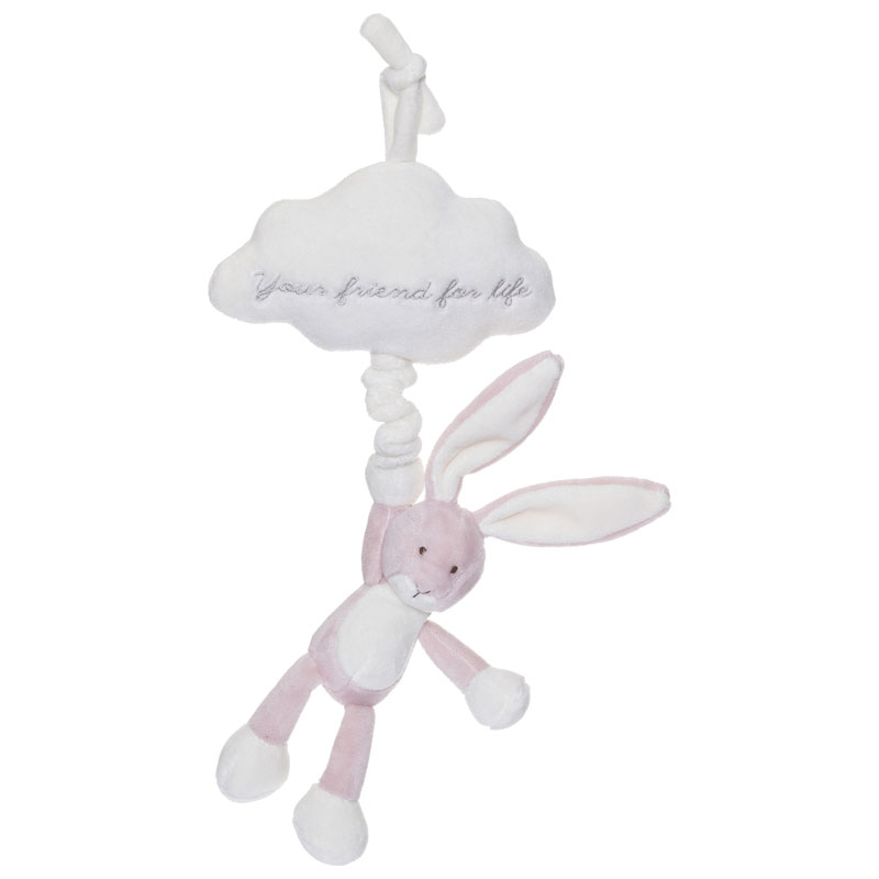 Diinglisar speldosa för lugna stunder. En mjuk speldosa i form av en rosa kanin som hänger från ett vitt moln med broderad text "Your friend for life".