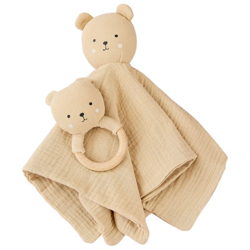 Den söta textilskallran med ett handtag i trä stimulerar barnets sinne och är en perfekt leksak att använda under barnets utvecklingsresa.