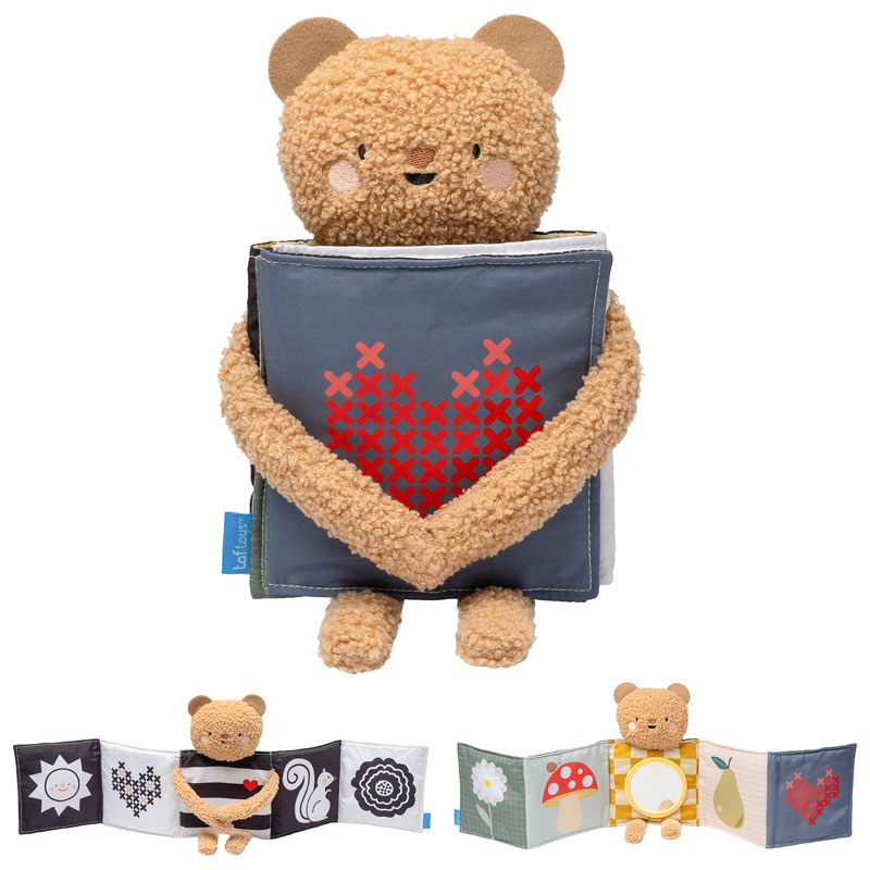 Sensorisk bok med tillhörande mjuk björn för gos och trygghet från Taf Toys. Boken har två olika sidor, den svartvita är för nyfödda och den färgglada för äldre barn.