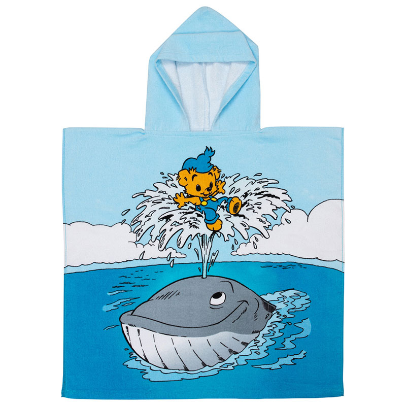 Härlig badponcho från Bamse, tillverkad i 100% bomull. Framsidan är prydd med ett motiv av en söt val och Bamse som leker tillsammans i havet.