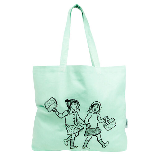 Fin tygkasse från Nordic Souvenir, med motiv av Alla vi barn i bullerbyn mot en grön botten.