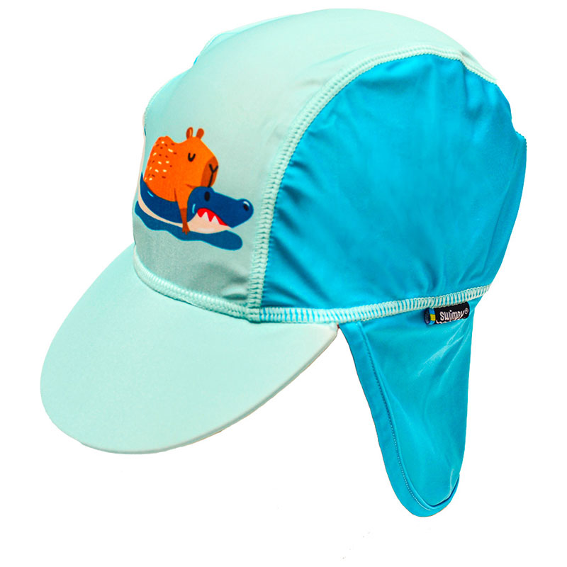 Fin, blå uv-hatt från Swimpy med motiv av en capybara som ligger på en haj.