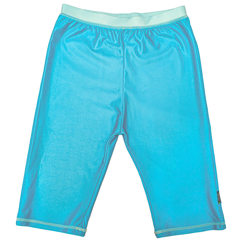 Härliga, blå UV-shorts från Swimpy med en ficka med motiv av en capybara som ligger på en haj på baksidan.