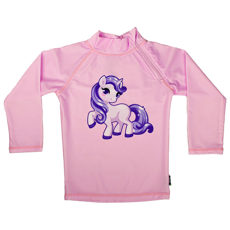Härlig, rosa UV-tröja från Swimpy med motiv av en enhörning med lila man och svans.