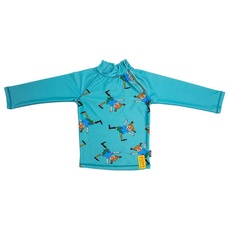 Härlig UV-tröja från Swimpy med mönster av Pippi som hjular mot en turkos botten.