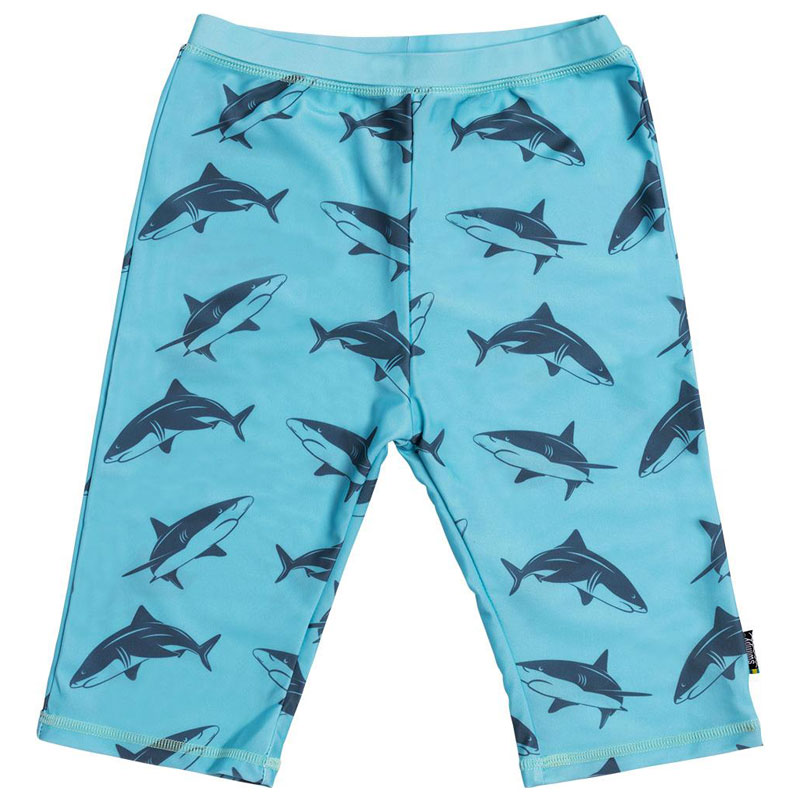 Härliga uv-shorts från Swimpy, med ett motiv av hajar på en blå bakgrund.