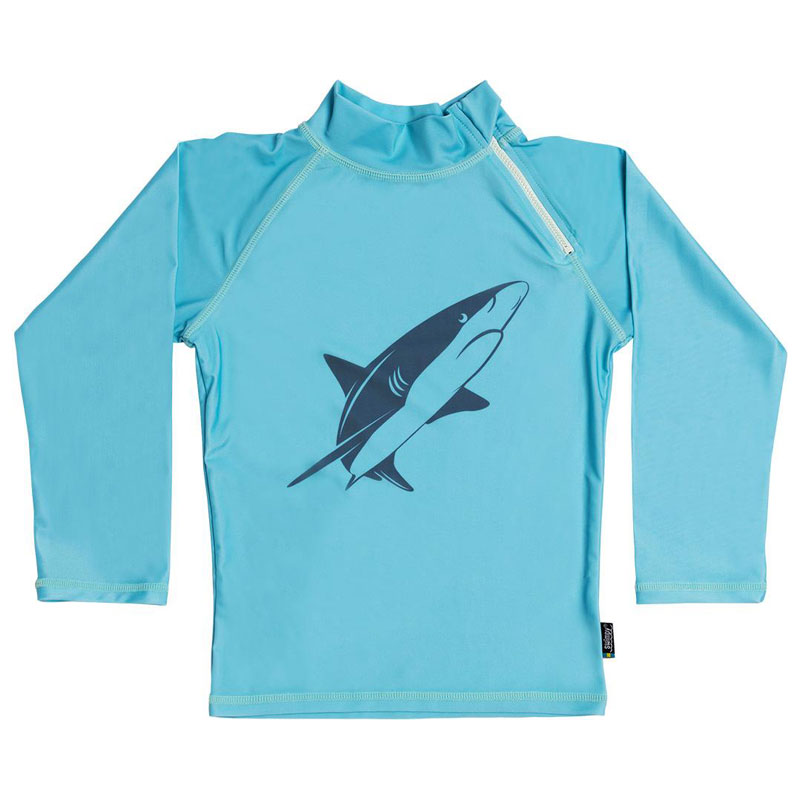 Härlig UV-tröja från Swimpy med motiv av en haj på en blå bakgrund.