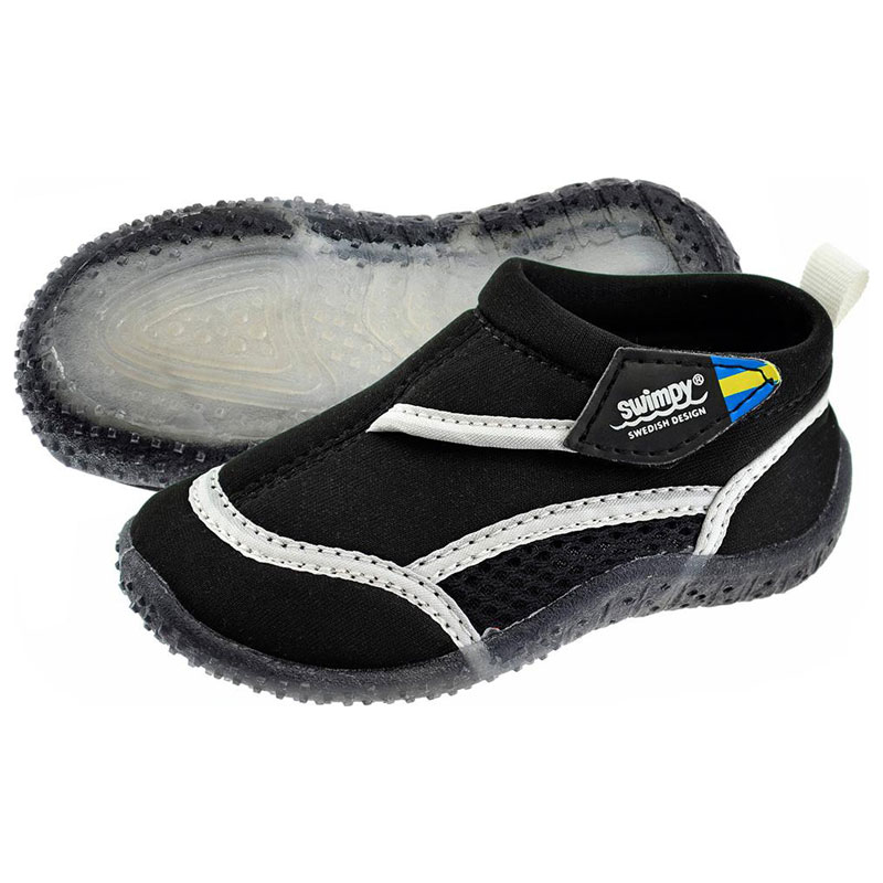 Lätta och smidiga strandskor från Swimpy. Skorna torkar snabbt och som skyddar barnet mot att skada och bränna fötterna på stranden.