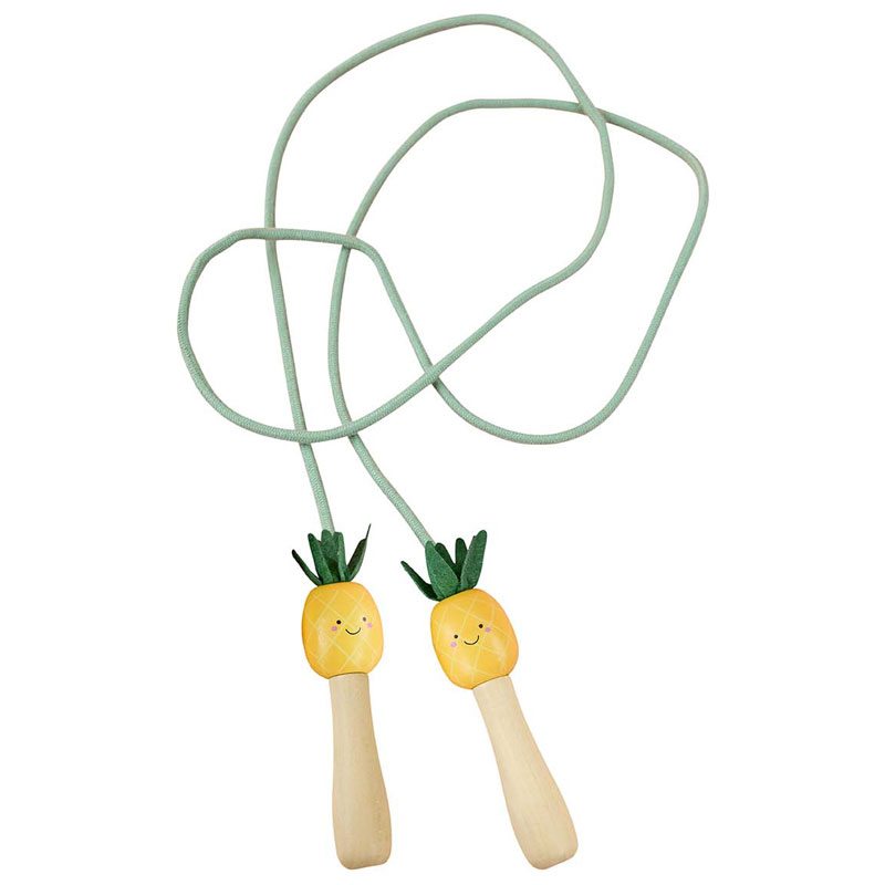 Hopprepet har trähandtag med målade ananaser ovanpå och ett rep i en dämpad grön nyans för en mjuk och lekfull look.