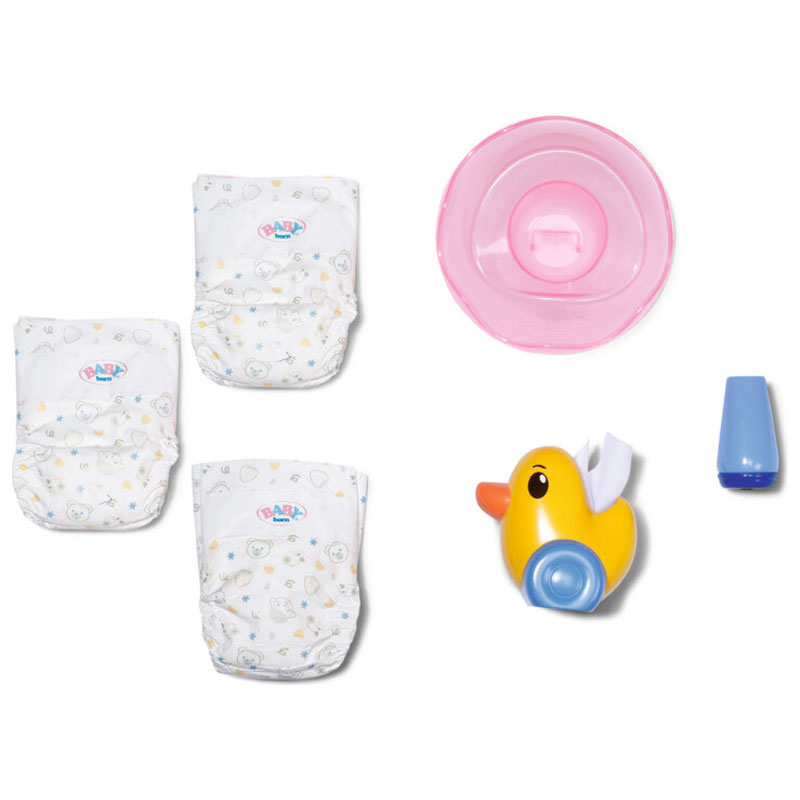 Potta-set till dockor från BABY Born. Med det här paketet kan alla små dockföräldrar göra vardagen med deras dockor ännu mer realistisk. Setet innehåller en dockpotta, två blöjor, en krämburk och den skojiga ankan Berta som praktisk pappersdispenser. Det gör potträningen till en lekfull och lärorik upplevelse.