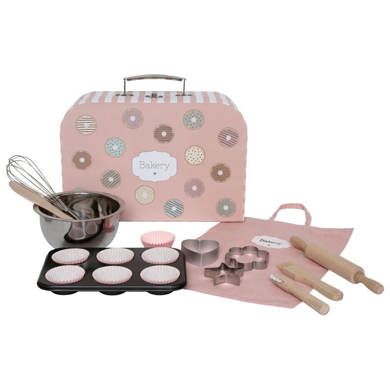Setet innehåller muffinsformar, en skål, en slickepott och söta kakformar – allt förpackat i en lekfull väska dekorerad med donuts.