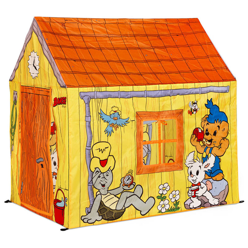 Rymligt lekhus med Bamse och hans vänner. Lätt att montera, instruktioner medföljer. Passar både inne och ute.