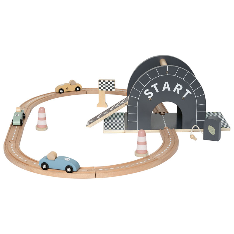 En stilren och lekfull racerbana i trä från Jabadabado får barnen att skapa sina egna biläventyr – från startflagga till målgång. Fyra färgglada racerbilar väntar på att tävla, och med vägkoner och målflagga sätts stämningen direkt.