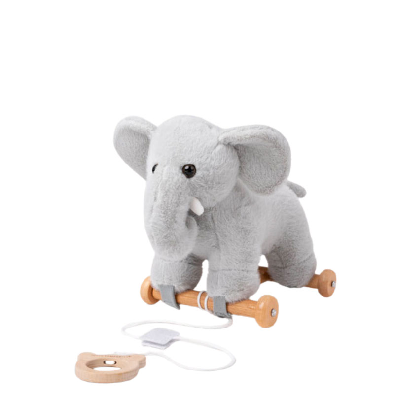 Elefanten sitter mjukt och säkert på den stabila träbasen, som enkel kan tas av när man vill leka med den som ett vanligt gosedjur. Kombinationen av drag- och gosedjur ger många möjligheter till lek, både stillsamt och i rörelse.