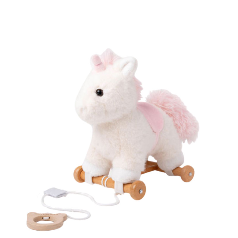 Enhörningen sitter mjukt och säkert på den stabila träbasen, som enkel kan tas av när man vill leka med den som ett vanligt gosedjur. Kombinationen av drag- och gosedjur ger många möjligheter till lek, både stillsamt och i rörelse.