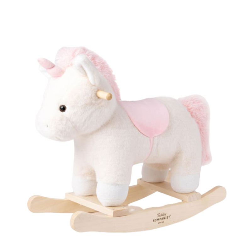 Charmigt gungdjur i form av en enhörning som snabbt blir en favorit hos små barn. Den mjuka plyschpälsen och det vadderade sätet för den bekväm att sitta på under lekstunden. De stabila trämedlarna och handtagen ger en trygg gungupplevslse, samtidigt som barnet tränar balans och koordination.