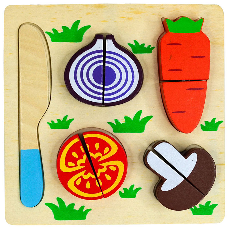 Delbara grönsaker från Toys by Tildas. Levereras med en kniv och fyra delbara kakor som hålls samman av kardborrefästen som kan separeras och sedan sättas ihop igen.
