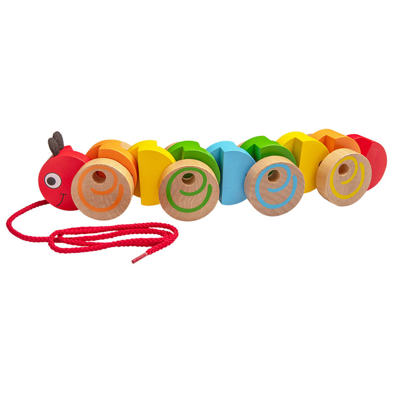 Färgglad dragleksak föreställande en larv med hjul som rullar när barnet drar den, från Toys by Tildas.