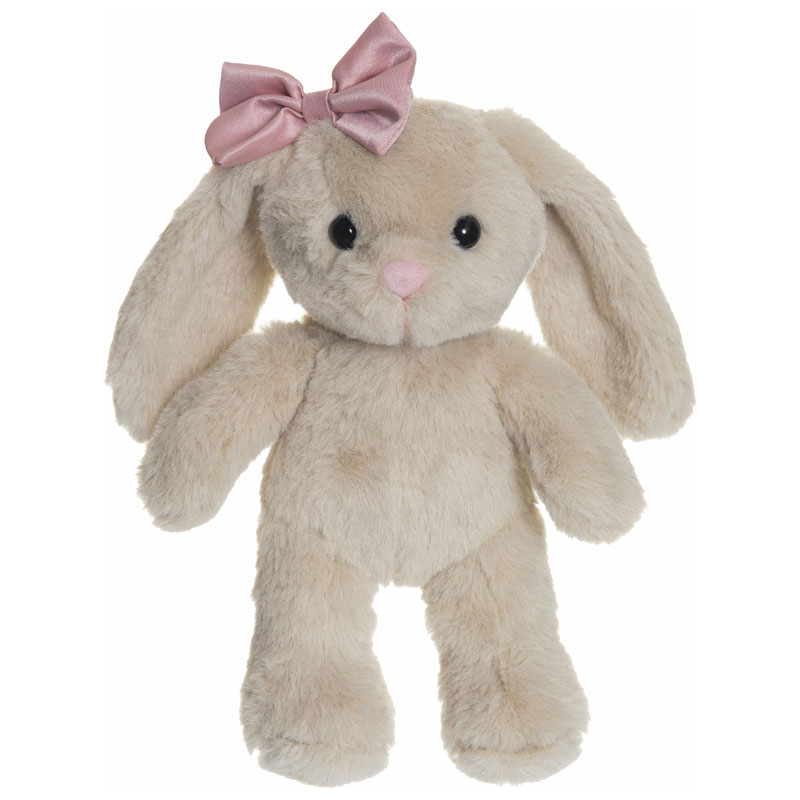 Tyra är en beige gosedjurskanin med långa öron och en rosa rosett vid örat. Med sitt lugna uttryck och lena päls är hon en trygg följeslagare, både vid vila och lek.