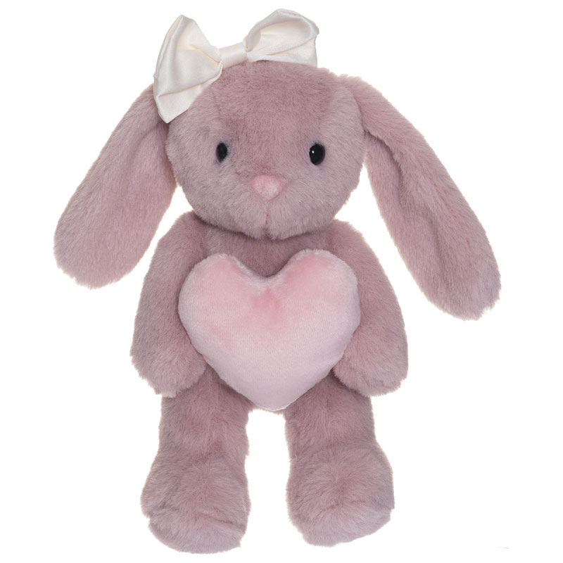 Tyra är en rosa gosedjurskanin med långa öron, en vit rosett och ett mjukt hjärta i famnen. Hon har ett lugnt uttryck och en mjuk päls som inbjuder till närhet och omtanke.