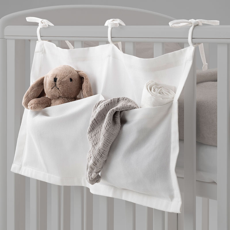 Fin förvaringsficka i vitt med knyttband och två fickor att lägga det man vill ha nära tillhands.
