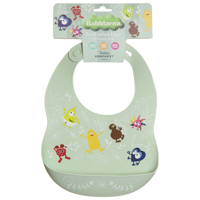 Mjuk och slitstark silikonhaklapp med motiv av Babblarna mot en grön botten.