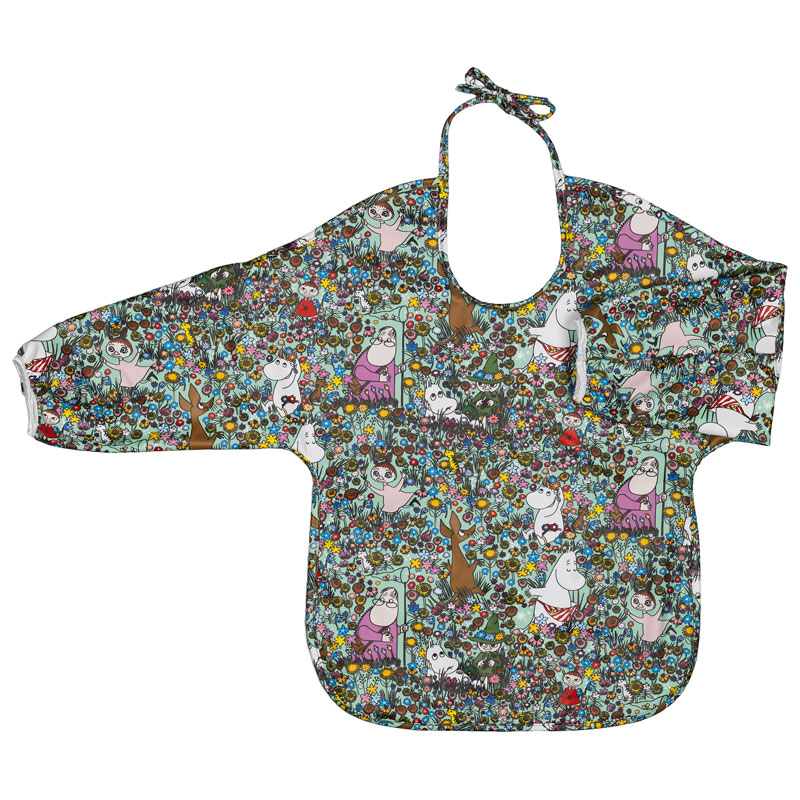 Underbar haklapp med ärm från Rätt Start. Med ett vackert Muminmotiv är denna haklapp en praktisk och söt lösning för de minsta vid måltider och lek.