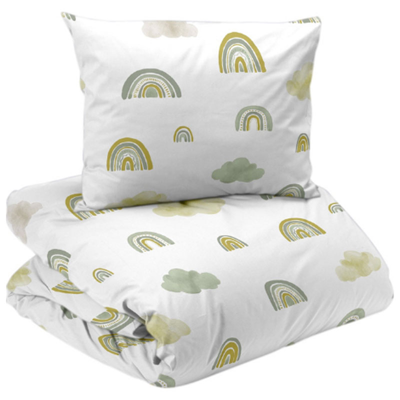Charmigt spjälsängspåslakan från Redlunds, prydd av regnbågar och moln i gröna nyanser mot en vit botten.