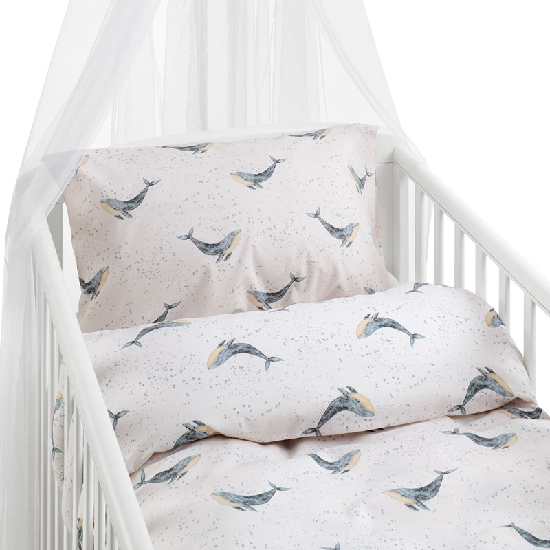 Härligt bäddset med mönster av blå valar från Borganäs. Setet kommer i mjuk och skön bomullskvalité och passar perfekt i barnrummet.