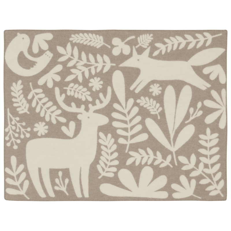 Skattekammer har ett gulligt mönster av djur och växter i beige och offwhite.