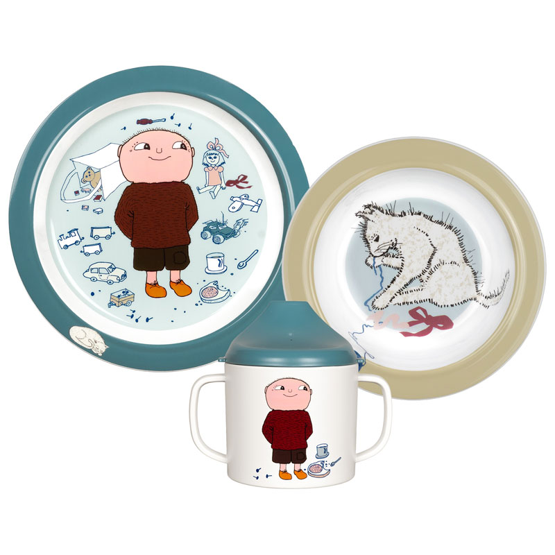 Gullig barnservis i tre delar med motiv av Alfons Åberg.