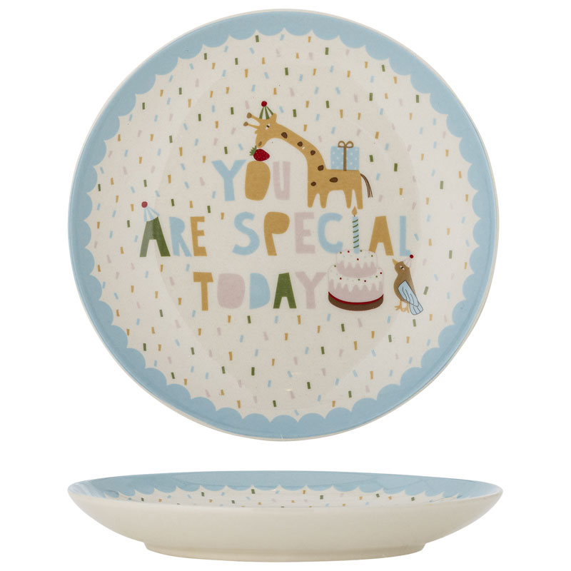 Celebrate är en ljuvlig tallrik från Bloomingville Mini, prydd av ett lekfullt motiv av djur och en tårta mot en flerfärgat botten.