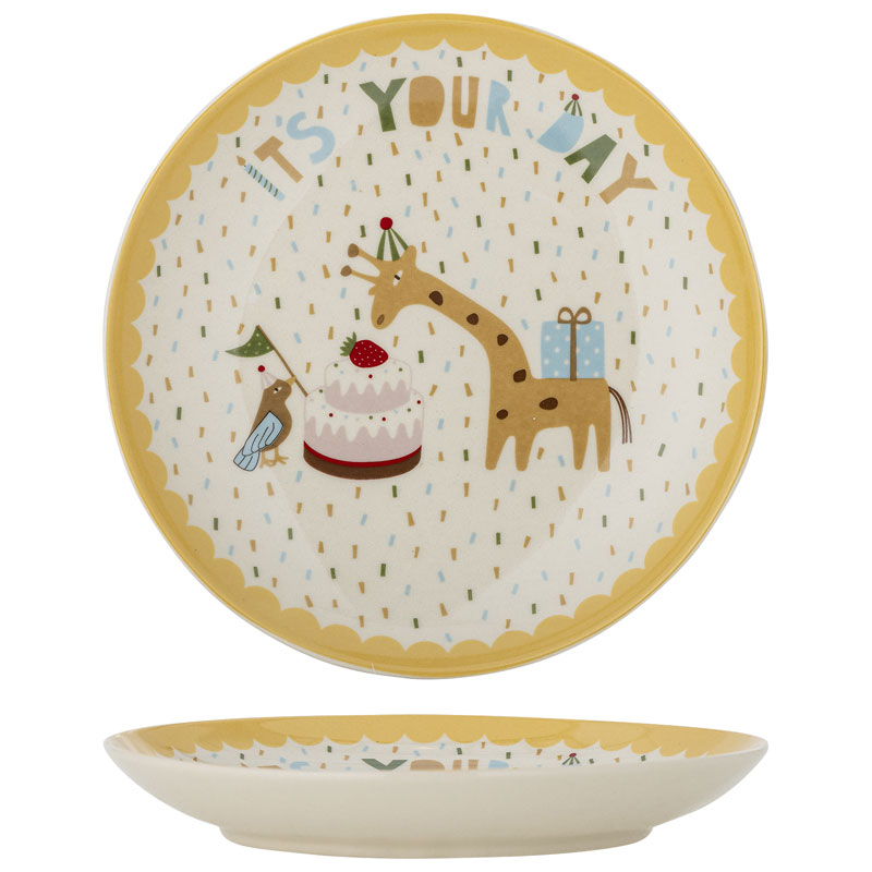 Celebrate är en ljuvlig tallrik från Bloomingville Mini, prydd av ett lekfullt motiv av djur och tårta mot en flerfärgat botten.