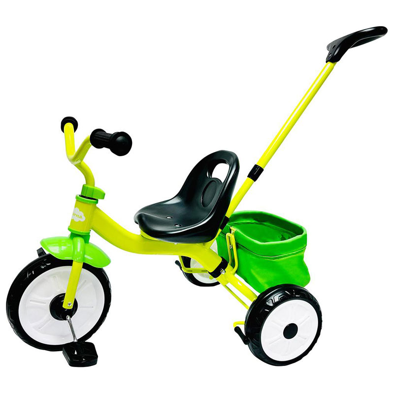 Cykeln har en avtagbar föräldrastång, tysta hjul i massiv EVA och handbroms på båda bakhjulen.